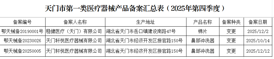 根据《医疗器械监督管理条例》( 国务院令第739号)、《医疗器械注册与备案管理办法》( 国家市场监督管理总局令第47号)和《国家药监局综合司关于加强第一类医疗器械备案管理的通知》(药监综械注〔2023〕89号)要求,现将我市第四季度已备案的第一类医疗器械产品备案信息予以公告。