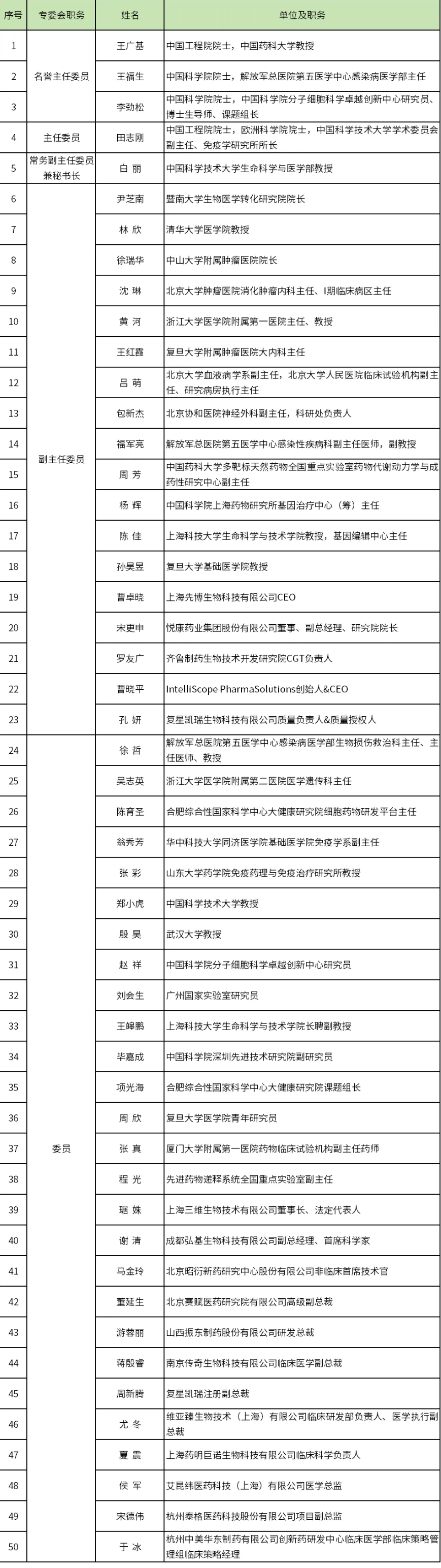 会议审议通过了CGT专委会第一届委员名单(附后),并推举中国工程院院士、中国药科大学教授王广基,中国科学院院士、解放军总医院第五医学中心感染病医学部主任王福生,中国科学院院士、中国科学院分子细胞科学卓越创新中心研究员李劲松担任名誉主任委员;选举中国工程院院士、中国科学技术大学免疫学研究所所长田志刚担任第一届主任委员。