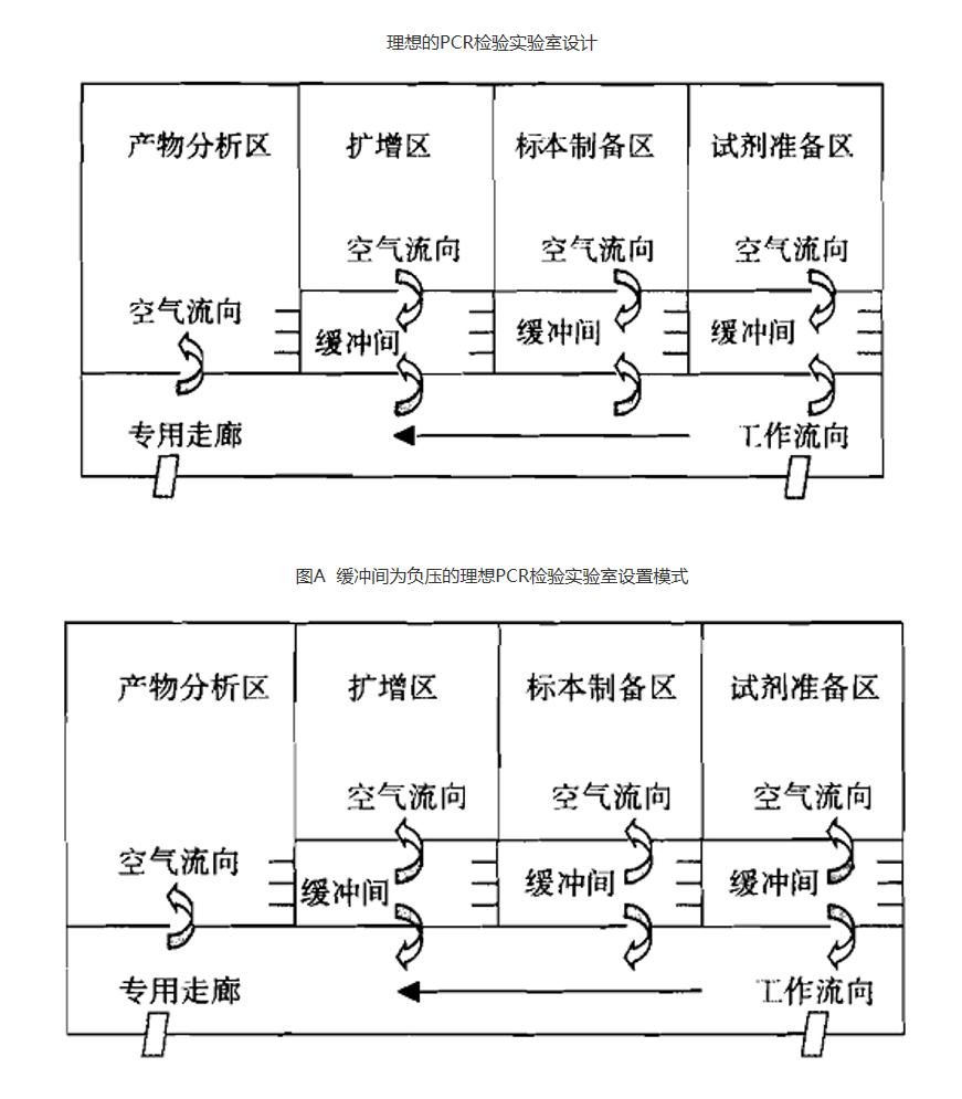 图B 缓冲间为正压的理想PCR检验实验室设置模式
