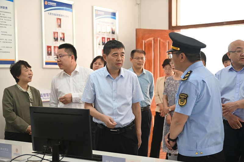 在修武县七贤市场监督管理所,段慧萍、田文才一行实地查看综合服务大厅、食品快检室等工作场所,详细了解该所业务能力建设、执法装备配备等情况,征求加强基层药品监管能力建设的意见建议,充分肯定了该所在加强基层药品监管、服务企业群众等方面的工作成效,希望该所立足职责实际,发挥职能作用,在强监管、优服务、提能力上取得更大成绩。