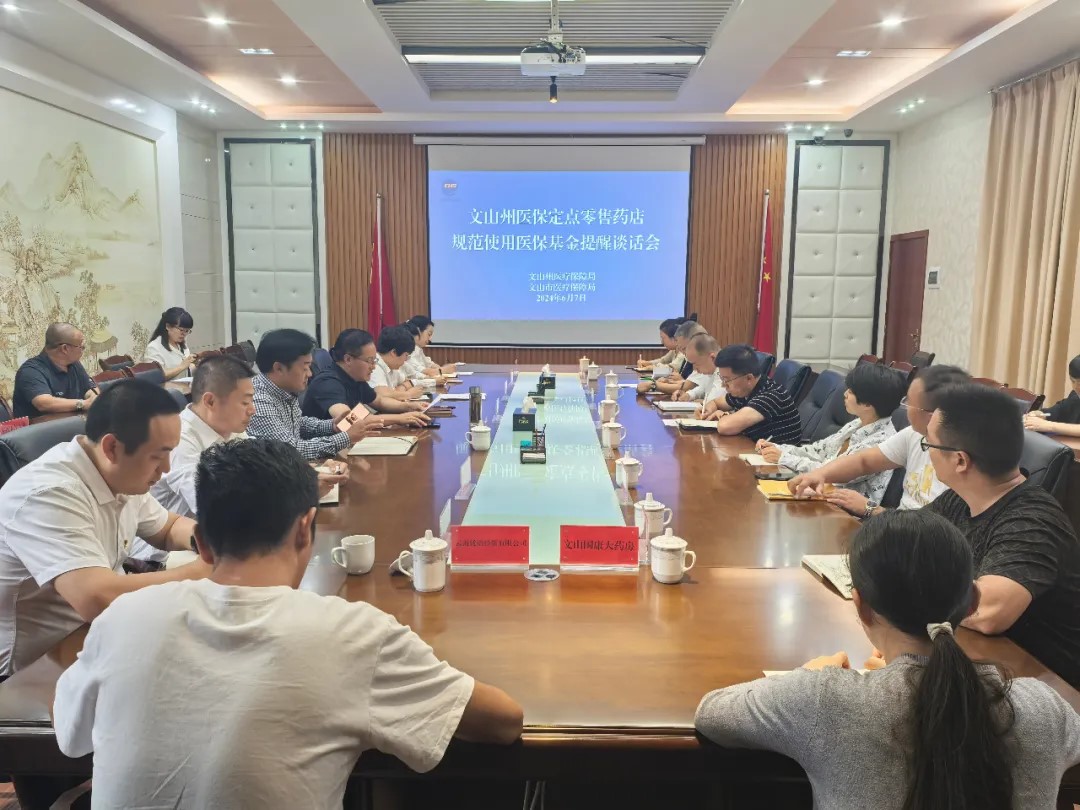 为进一步规范文山州辖区内医保定点零售药店的医保基金使用行为,督促药品零售企业对照国家医保局约谈一心堂药业集团公司时通报的问题开展自查自纠、举一反三整改,促进企业依法经营、守法经营,2024年6月7日,文山州医疗保障局、文山市医疗保障局组织开展医保定点零售药店规范使用医保基金提醒谈话。文山州内药品零售门店较多的10家药品零售企业代表参加会议。