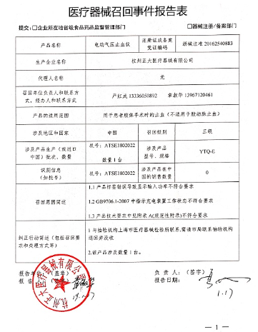 杭州正大医疗器械有限公司报告,由于在国家医疗器械监督抽检中发现该产品标签错误导致显示输入功率不符合要求等问题,杭州正大医疗器械有限公司对其生产的电动气压止血仪(注册证号:浙械注准20162540883)主动召回。召回级别为三级。涉及产品的型号、规格及批次等详细信息见《医疗器械召回事件报告表》。