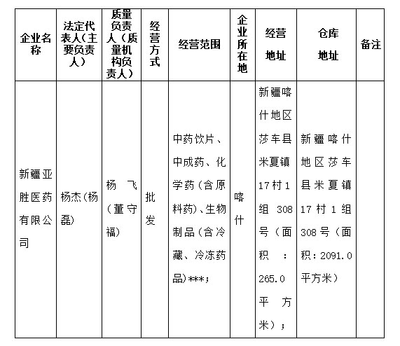 新疆亚胜医药有限公司申请换发《药品经营许可证》,按照法定程序经检查验收,符合《药品经营和使用质量监督管理办法》(国家市场监督管理总局令第84号)《食品药品监管总局关于修订印发〈药品经营质量管理规范现场检查指导原则〉有关事宜的通知》(食药监药化监[2016]160号)、关于印发《新疆维吾尔自治区药品现代物流规范建设实施细则(试行)》《新疆维吾尔自治区药品第三方物流规范建设实施细则(试行)》(新药监规〔2024〕5号)的通知等相关要求,现予以公示,请社会各界予以监督。