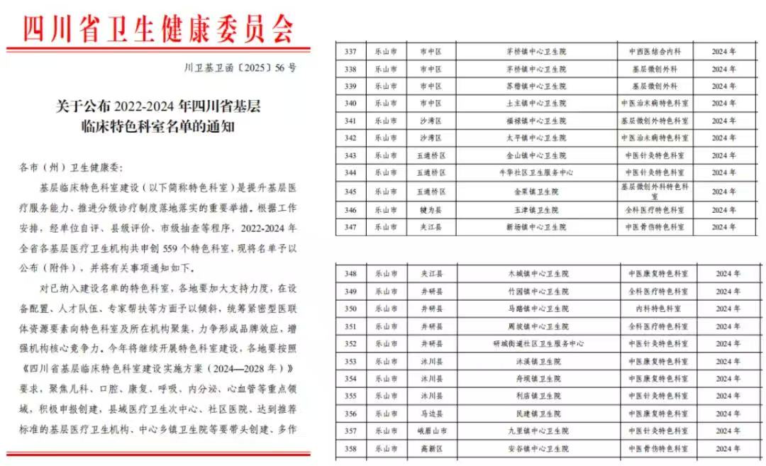 近日,四川省卫生健康委员会发布2024年四川省基层临床特色科室名单,经过机构自评、县级初评、市级复核、省级一致性评价,我市共22个基层医疗机构临床科室创建为基层临床特色科室。