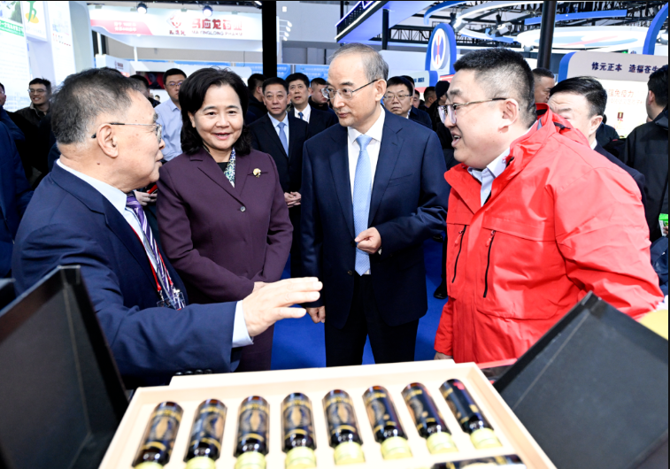 本届长春健博会以“新质引领健康、科技共创未来”为主题,吸引了648户企业参展,展出了众多医药健康领域最新科技成果,其中人参产品品类丰富、最受关注。黄强、胡玉亭到吉林长白山人参主题馆、通化展区等展馆展区驻足察看,与商家亲切交流,详细了解参展及经营情况,鼓励商家展好参、卖好参,让货真价实、优质优价成为常态。长春中医药大学和中国科学院长春光机所等多家单位联合攻关,利用高光谱成像仪,开展野山参参龄和质量检测鉴定。黄强、胡玉亭察看了解操作流程,希望他们进一步完善技术,不断提高检测精度,切实提升产品鉴定权威性和可信度。在成都城市展台前,黄强说,吉川两地中医药合作空间广阔,希望双方进一步加强交流互鉴,携手做优做强中医药产业。黄强、胡玉亭还听取了长春·永春现代生物医药城发展规划介绍。