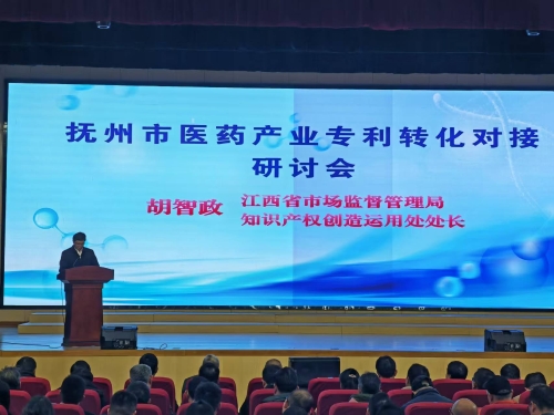 胡智政指出:在抚州市委、市政府坚强领导下,抚州知识产权工作成效显著,为我省知识产权强省建设作出了重要贡献。年初抚州获评“国家知识产权强市建设试点城市”,抚州市局与东华理工大学共建的“抚州市知识产权信息公共服务平台”荣获国家知识产权信息公共服务网点优秀案例,知识产权基层工作站案例入选知识产权强国建设典型案例,各项工作亮点频出,可喜可贺!开展医药领域专利转化对接是推进企业自主创新、强化高校成果转化的重要举措,要培育一批医药领域优秀领头企业,打造一批医药领域高价值发明专利,促进一批具有经济效益的专利转化运用,提高产业核心竞争力。
