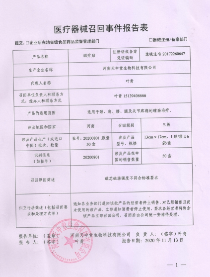 河南天中堂生物科技有限公司报告,由于其生产的一批次磁疗贴磁芯磁场强度不符合规定,企业对其主动召回,召回级别为三级。召回产品的型号、规格及批次等详细信息见《医疗器械召回事件报告表》。