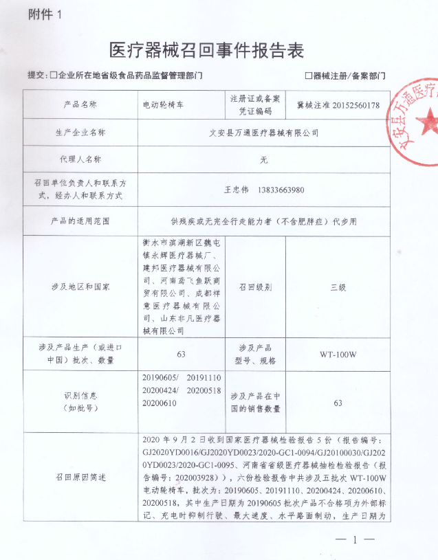 文安县万通医疗器械有限公司报告,由于在2020年国家医疗器械监督抽验中该公司生产的电动轮椅车被检验单位判定为不合格,具体涉及产品批号和不合格项见附件中图片。该公司将涉及批次电动轮椅车主动召回,召回级别三级。