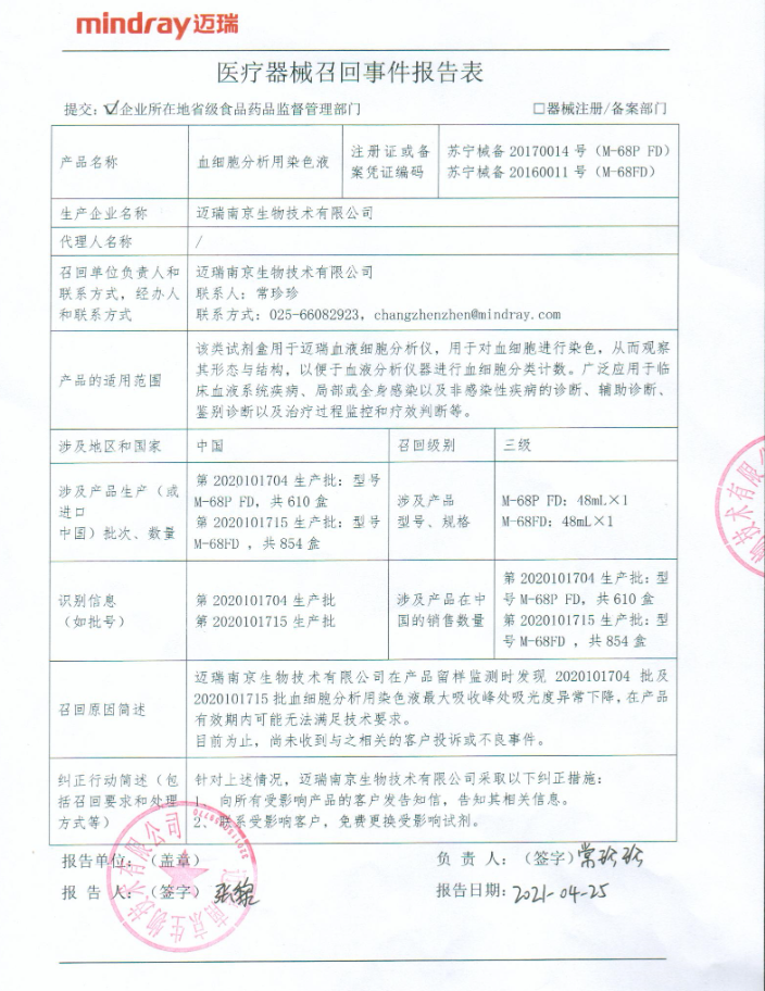 迈瑞南京生物技术有限公司报告,该企业在对留样产品监测时发现血细胞分析用染色液最大吸收峰处吸光度异常下降,在产品有效期内可能无法满足技术要求,现主动召回,召回级别为三级。涉及产品的具体信息见《医疗器械召回事件报告表》