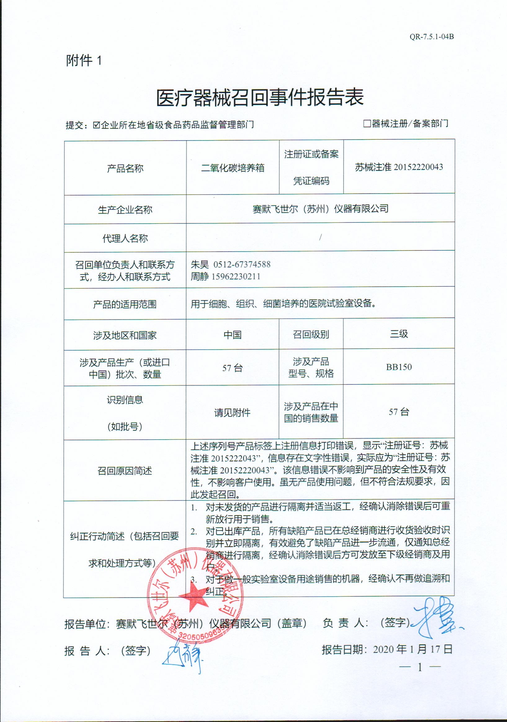 赛默飞世尔(苏州)仪器有限公司报告,由于序列号产品标签上注册信息打印错误,将二氧化碳培养箱注册证号“苏械注准20152220043”打印成“苏械注准2015222043”,未影响使用,但不符合法规要求,因此进行主动召回,召回级别为三级。涉及产品的型号、规格、数量见《医疗器械召回事件报告表》。