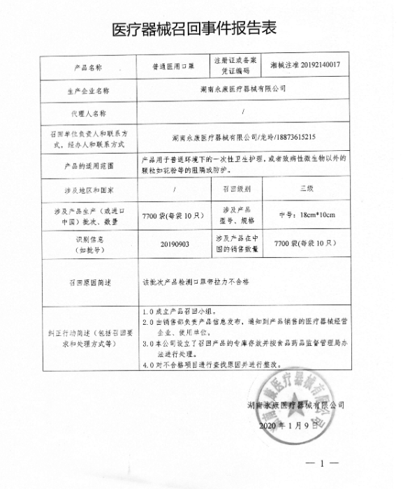湖南永康医疗器械有限公司报告,由于普通医用口罩不符合经注册产品技术要求的原因,湖南永康医疗器械有限公司对其生产的普通医用口罩(注册或备案号:湘械注准20192140017)主动召回。召回级别为 三级? 。涉及产品的型号、规格及批次等详细信息见《医疗器械召回事件报告表》。