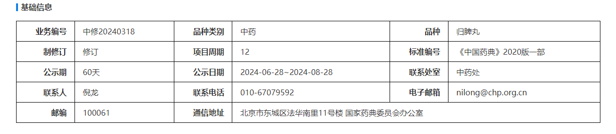 我委拟修订归脾丸国家药品标准,标准编号:《中国药典》2020版一部。为确保标准的科学性、合理性和适用性,现将拟修订的归脾丸国家药品标准公示征求社会各界意见(详见附件)。公示期自发布之日起二个月。请认真研核,若有异议,请及时在线反馈,并附相关说明、实验数据和联系方式。来函需打印后加盖公章,个人来函需打印后本人签名,并邮寄至我委通讯地址。