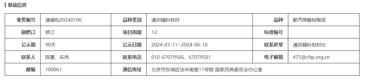 我委拟修订聚丙烯酸树脂Ⅲ国家药用辅料标准。为确保标准的科学性、合理性和适用性,现将拟修订的标准公示征求社会各界意见(详见附件)。公示期自发布之日起三个月。请认真研核,若有异议,请及时在线反馈,并附相关说明、实验数据和联系方式。来函需打印后加盖公章,个人来函需打印后本人签名,并邮寄至我委通讯地址。