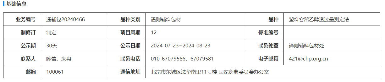 我委拟制定塑料容器乙醇透过量测定法。为确保标准的科学性、合理性和适用性,现将拟制定的标准公示征求社会各界意见(详见附件)。公示期自发布之日起一个月。请认真研核,若有异议,请及时在线反馈,并附相关说明、实验数据和联系方式。来函需打印后加盖公章,个人来函需打印后本人签名,并邮寄至我委通讯地址。 公示期满未回复意见即视为对公示标准草案无异议。