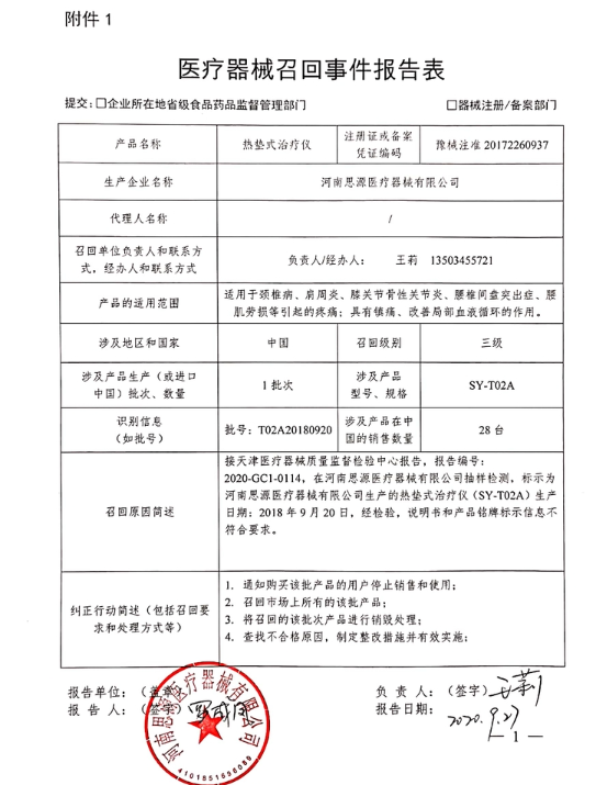 河南思源医疗器械有限公司报告,由于企业生产的热垫式治疗仪的说明书和产品标识信息不符合要求,(涉及产品的型号、规格及批次等详细信息见《医疗器械召回事件报告表》),企业对其生产的热垫式治疗仪主动召回。召回级别为三级。