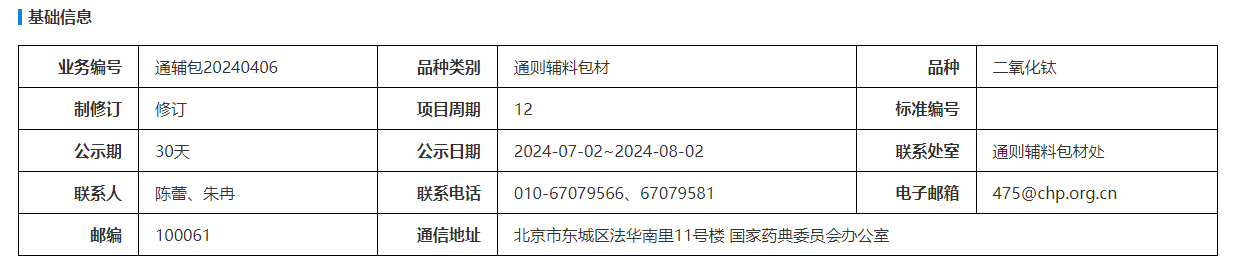 我委拟修订二氧化钛国家药用辅料标准。为确保标准的科学性、合理性和适用性,现将拟修订的标准公示征求社会各界意见(详见附件)。公示期自发布之日起一个月。请认真研核,若有异议,请及时在线反馈,并附相关说明、实验数据和联系方式。来函需打印后加盖公章,个人来函需打印后本人签名,并邮寄至我委通讯地址。