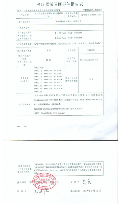 飞利浦医疗(苏州)有限公司报告,该企业在内部检测中发现其生产的移动式数字化医用x射线摄影系统(产品型号:MobileDiagnost wDR)未粘贴2类中文激光说明标签,现主动召回,召回级别为三级。涉及 产品的具体信息见《医疗器械召回事件报告表》