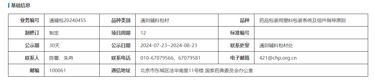 我委拟制定药品包装用塑料包装系统及组件指导原则。为确保标准的科学性、合理性和适用性,现将拟制定的标准公示征求社会各界意见(详见附件)。公示期自发布之日起一个月。请认真研核,若有异议,请及时在线反馈,并附相关说明、实验数据和联系方式。来函需打印后加盖公章,个人来函需打印后本人签名,并邮寄至我委通讯地址。