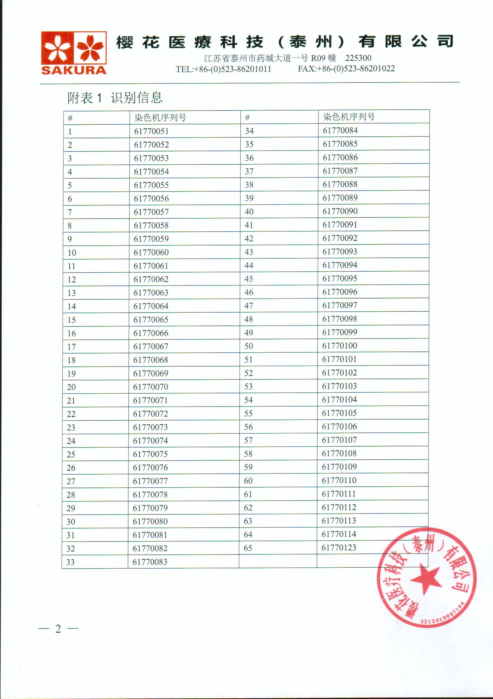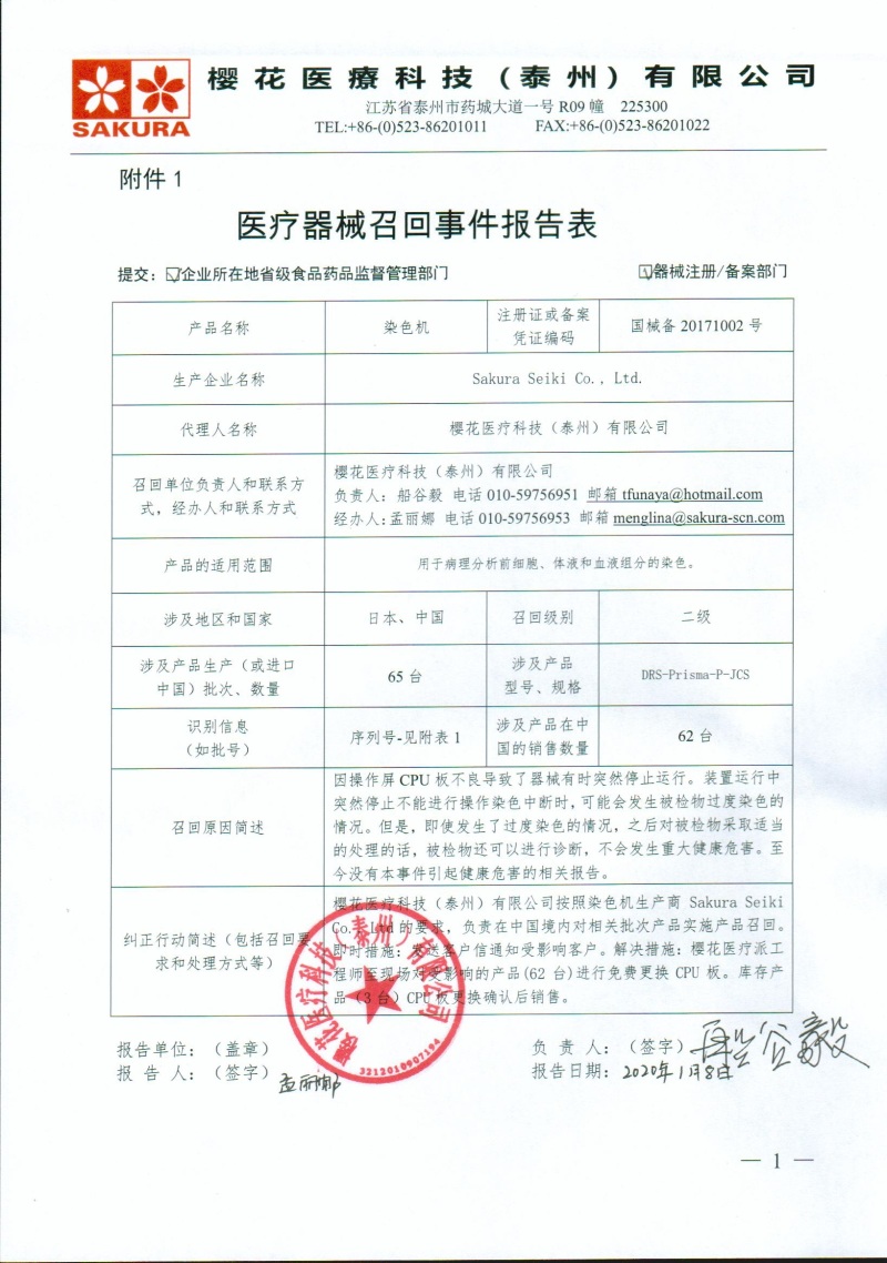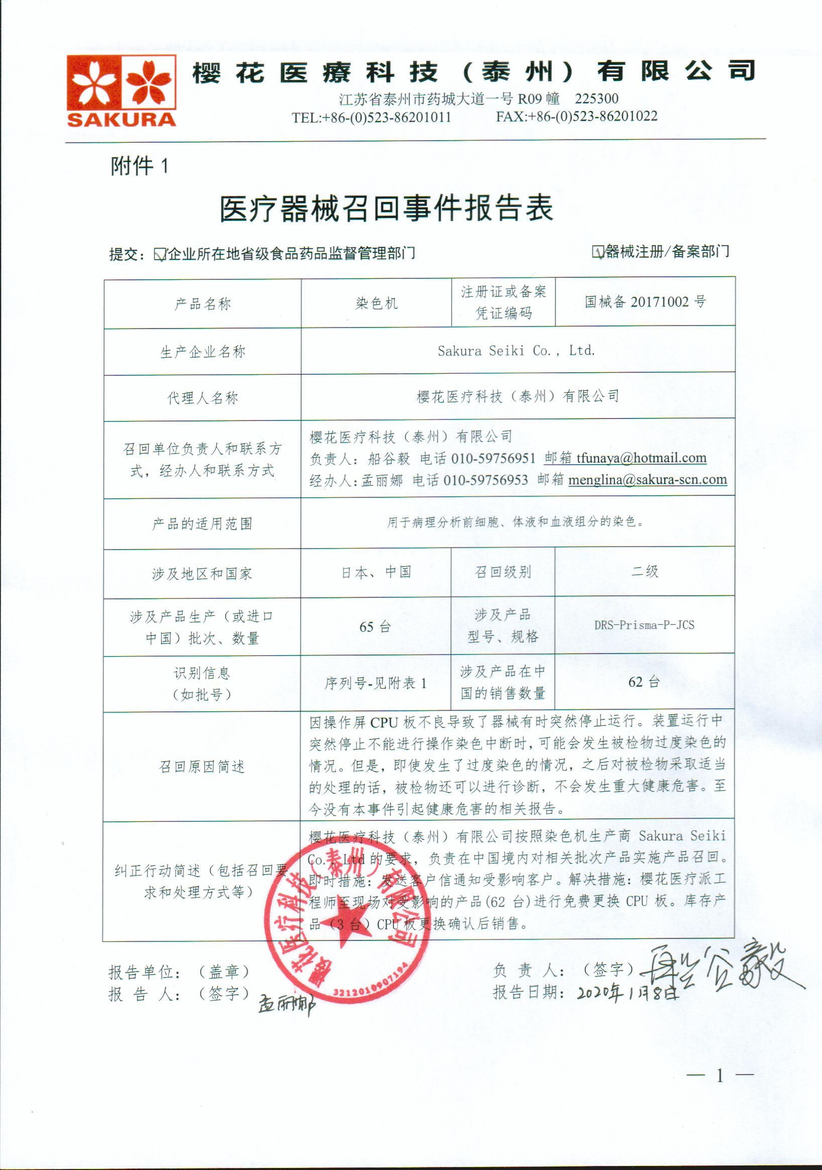 樱花医疗科技(泰州)有限公司报告,由于操作屏CPU板不良会导致器械会突然停止运行,生产商Sakura Seiki.,Ltd.对其生产的染色机(备案号:国械备20171002号)主动召回,召回级别为二级。涉及产品的具体信息见《医疗器械召回事件报告表》