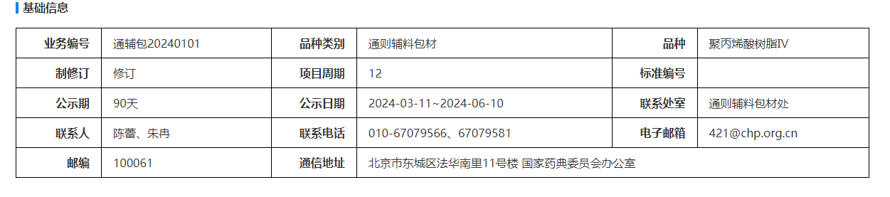 我委拟修订聚丙烯酸树脂Ⅳ国家药用辅料标准。为确保标准的科学性、合理性和适用性,现将拟修订的标准公示征求社会各界意见(详见附件)。公示期自发布之日起三个月。请认真研核,若有异议,请及时在线反馈,并附相关说明、实验数据和联系方式。来函需打印后加盖公章,个人来函需打印后本人签名,并邮寄至我委通讯地址。