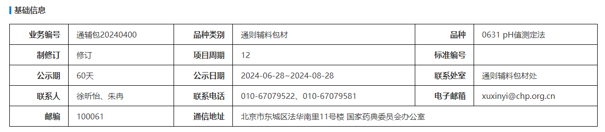 我委拟修订《中国药典》0631 pH值测定法。为确保标准的科学性、合理性和适用性,现将拟修订的0631 pH值测定法公示征求社会各界意见(详见附件)。公示期自发布之日起两个月。请认真研核,若有异议,请及时在线反馈,并附相关说明、实验数据和联系方式。来函需打印后加盖公章,个人来函需打印后本人签名,并邮寄至我委通讯地址。
