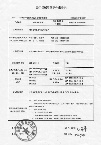 湖南慈辉医疗科技有限公司,由于生产销售未经注册的第二类医疗器械的原因,湖南慈辉医疗科技有限公司对其生产的中医灸疗器具主动召回。召回级别为 三级? 。涉及产品的型号、规格及批次等详细信息见《医疗器械召回事件报告表》。