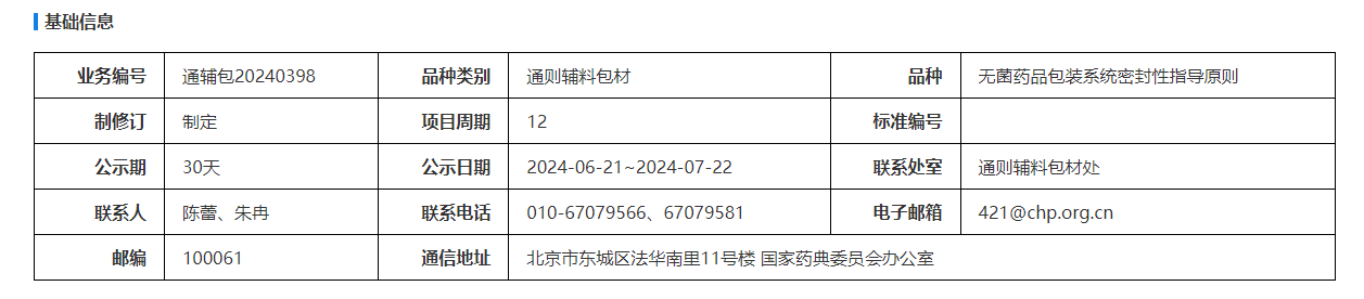 我委拟制定无菌药品包装系统密封性指导原则。为确保标准的科学性、合理性和适用性,现将拟制定的标准公示征求社会各界意见(详见附件)。公示期自发布之日起一个月。请认真研核,若有异议,请及时在线反馈,并附相关说明、实验数据和联系方式。来函需打印后加盖公章,个人来函需打印后本人签名,并邮寄至我委通讯地址。
