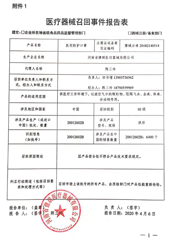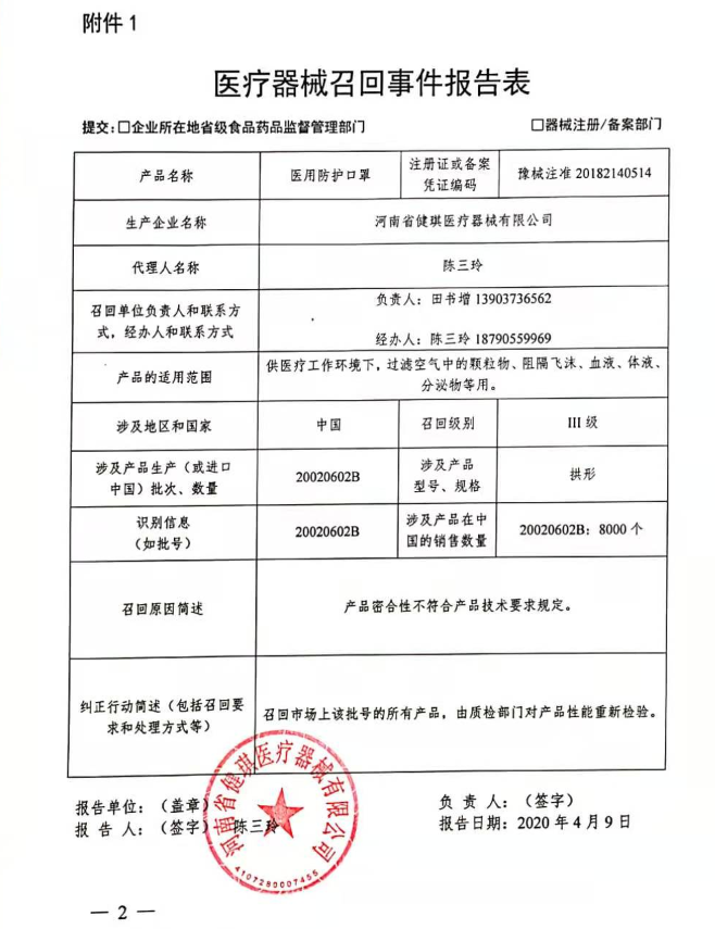 河南省健琪医疗器械有限公司报告,由于其生产的两批次医用防护口罩密合性不符合规定,企业对其主动召回,召回级别为三级。召回产品的型号、规格及批次等详细信息见《医疗器械召回事件报告表》。