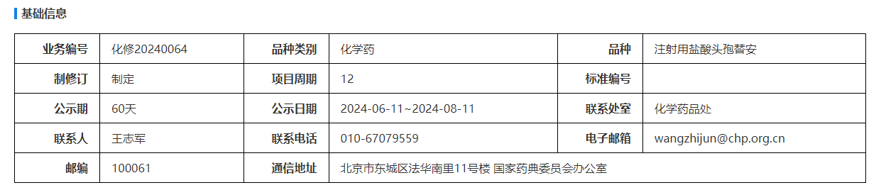 我委拟制定注射用盐酸头孢替安国家药品标准。为确保标准的科学性、合理性和适用性,现将拟制定的注射用盐酸头孢替安国家药品标准公示征求社会各界意见(详见附件)。公示期自发布之日起两个月。请认真研核,若有异议,请及时在线反馈,并附相关说明、实验数据和联系方式。来函需打印后加盖公章,个人来函需打印后本人签名,并邮寄至我委通讯地址。