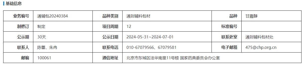 我委拟制定甘露醇国家药用辅料标准。为确保标准的科学性、合理性和适用性,现将拟制定的标准公示征求社会各界意见(详见附件)。公示期自发布之日起一个月。请认真研核,若有异议,请及时在线反馈,并附相关说明、实验数据和联系方式。来函需打印后加盖公章,个人来函需打印后本人签名,并邮寄至我委通讯地址。