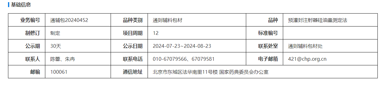 我委拟制定预灌封注射器硅油量测定法。为确保标准的科学性、合理性和适用性,现将拟制定的标准公示征求社会各界意见(详见附件)。公示期自发布之日起一个月。请认真研核,若有异议,请及时在线反馈,并附相关说明、实验数据和联系方式。来函需打印后加盖公章,个人来函需打印后本人签名,并邮寄至我委通讯地址。