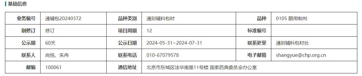 我委拟修订0105眼用制剂国家药品标准。为确保标准的科学性、合理性和适用性,现将拟修订的标准公示征求社会各界意见(详见附件)。公示期自发布之日起二个月。请认真研核,若有异议,请及时在线反馈,并附相关说明、实验数据和联系方式。来函需打印后加盖公章,个人来函需打印后本人签名,并邮寄至我委通讯地址。