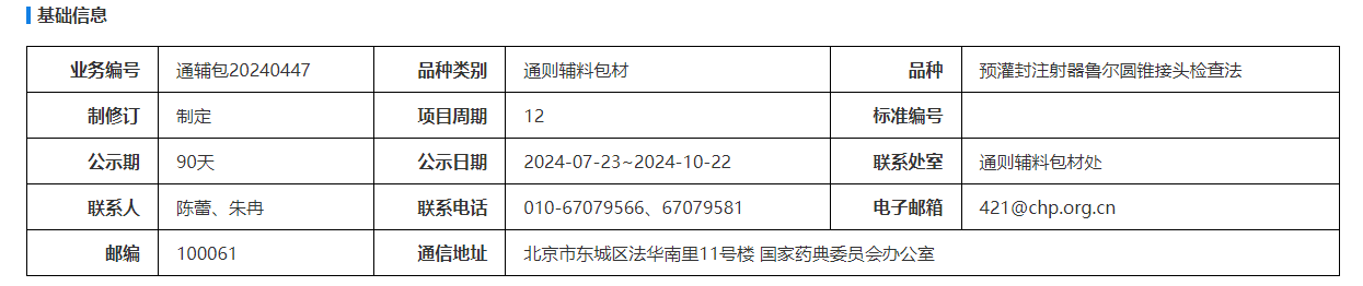 我委拟制定预灌封注射器鲁尔圆锥接头检查法。为确保标准的科学性、合理性和适用性,现将拟制定的标准公示征求社会各界意见(详见附件)。公示期自发布之日起一个月。请认真研核,若有异议,请及时在线反馈,并附相关说明、实验数据和联系方式。来函需打印后加盖公章,个人来函需打印后本人签名,并邮寄至我委通讯地址。