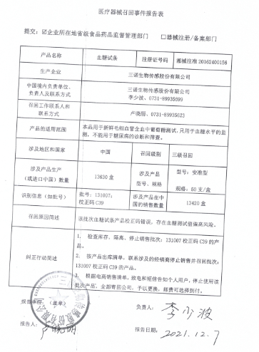 三诺生物传感股份有限公司报告,由于血糖试条产品校正码错误,存在血糖测试值偏高风险,三诺生物传感股份有限公司对其生产的血糖试条(型号:安准型,规格:50支/盒,批号: 131007)主动召回。召回级别为三级。涉及产品的型号、规格及批次等详细信息见《医疗器械召回事件报告表》。