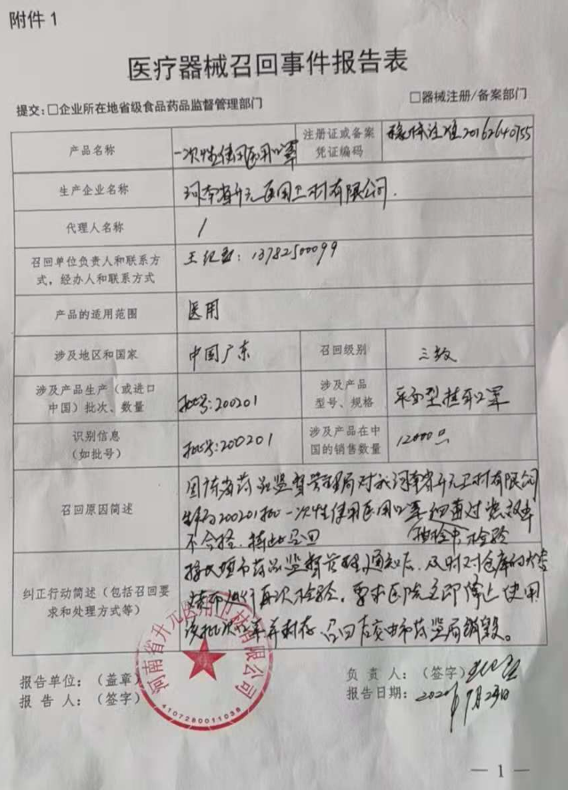 河南省升元医用卫材有限公司报告,由于其生产的一批次一次性使用医用口罩细菌过滤效率不符合规定,企业对其主动召回,召回级别为三级。召回产品的型号、规格及批次等详细信息见《医疗器械召回事件报告表》。