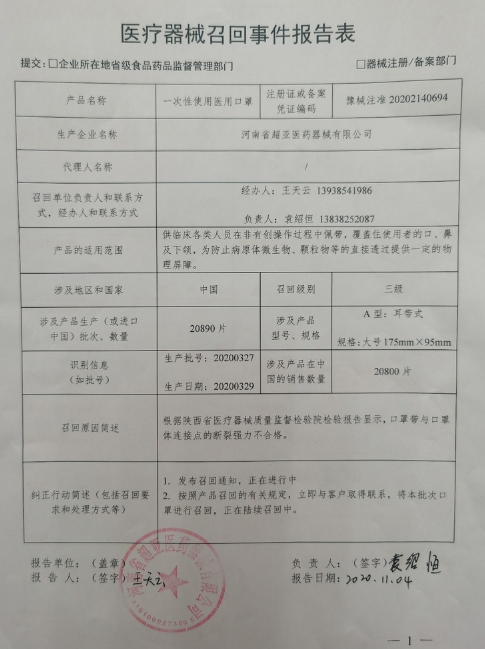 河南省超亚医药器械有限公司报告,由于其生产的一批次一次性使用医用口罩口罩带不符合规定,企业对其主动召回,召回级别为三级。召回产品的型号、规格及批次等详细信息见《医疗器械召回事件报告表》。
