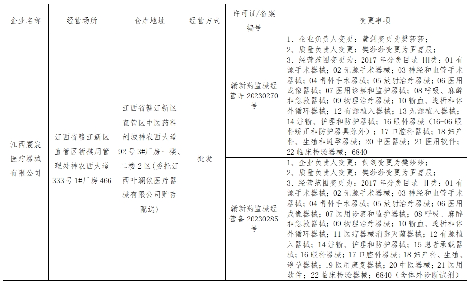 根据《医疗器械监督管理条例》和《医疗器械经营监督管理办法》的规定及有关要求,经审查合格,以下企业申请《医疗器械经营许可证》、第二类医疗器械经营备案变更业务符合有关规定,经我局同意,现将许可信息予以公示。