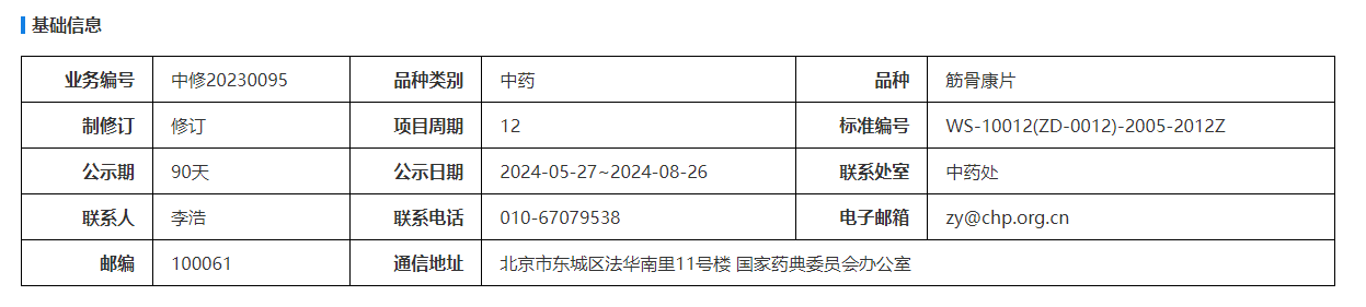 我委拟将筋骨康片收入中国药典一部。为确保标准的科学性、合理性和适用性,现将拟修订的筋骨康片国家药品标准公示征求社会各界意见(详见附件)。公示期自发布之日起三个月。请认真研核,若有异议,请及时在线反馈,并附相关说明、实验数据和联系方式。来函需打印后加盖公章,个人来函需打印后本人签名,并邮寄至我委通讯地址。