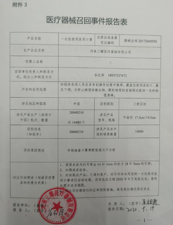 河南三耀医疗器械有限公司报告,由于其生产的一批次一次性使用医用口罩口罩带和一批次医用一次性防护服断裂强力不符合规定,企业对其主动召回,召回级别为三级。召回产品的型号、规格及批次等详细信息见《医疗器械召回事件报告表》。