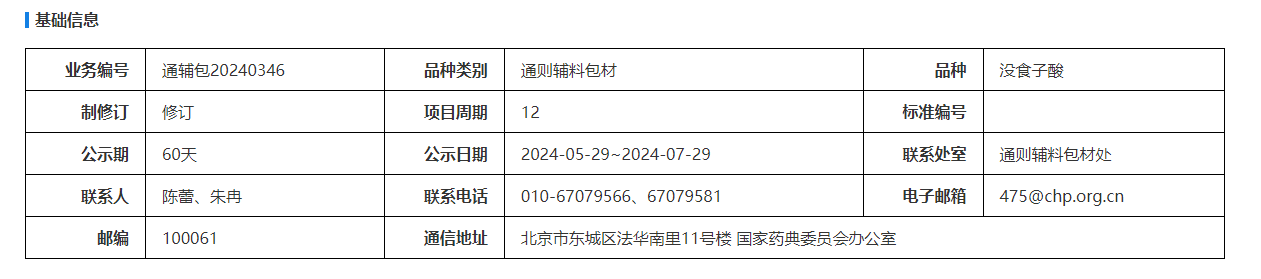 我委拟修订没食子酸国家药用辅料标准。为确保标准的科学性、合理性和适用性,现将拟修订的标准公示征求社会各界意见(详见附件)。公示期自发布之日起二个月。请认真研核,若有异议,请及时在线反馈,并附相关说明、实验数据和联系方式。来函需打印后加盖公章,个人来函需打印后本人签名,并邮寄至我委通讯地址。