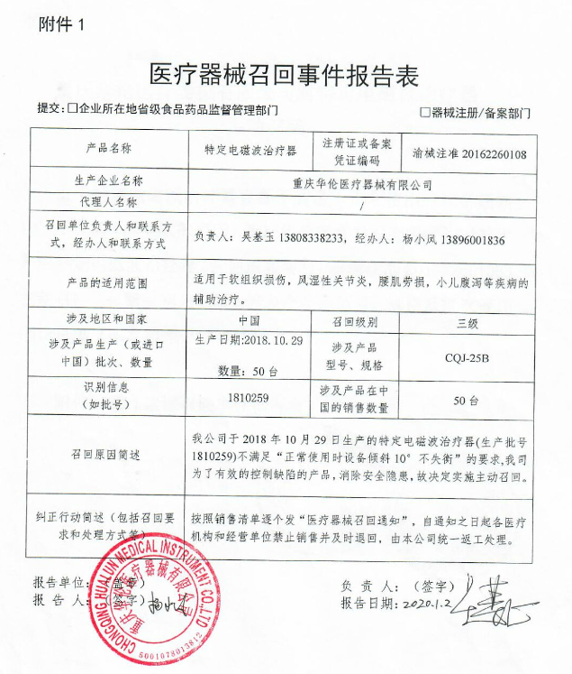 由于特定电磁波治疗器设备不满足“正常使用时设备倾斜10°不失衡”的要求等原因,重庆华伦医疗器械有限公司对其生产的特定电磁波治疗器(注册或备案号:渝械注准20162260108)主动召回。召回级别为三级。涉及产品的型号、规格及批次等详细信息见《医疗器械召回事件报告表》。