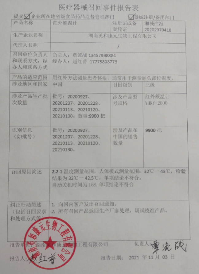 湖南英和康元生物工程有限公司报告,由于红外额温计产品抽检结果不符合规定,湖南英和康元生物工程有限公司对其生产的红外额温计(注册或备案号:湘械注准20202070418)主动召回。召回级别为三级。涉及产品的型号、规格及批次等详细信息见《医疗器械召回事件报告表》。