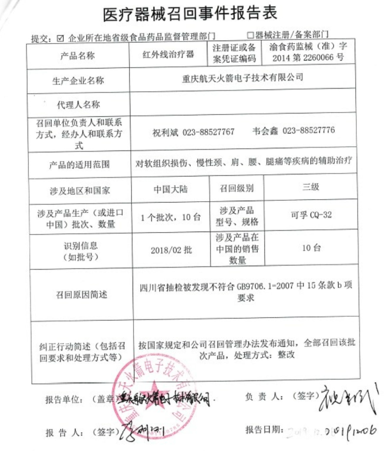 重庆航天火箭电子技术有限公司对红外线治疗器主动召回