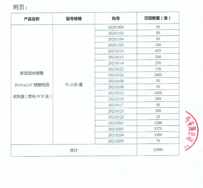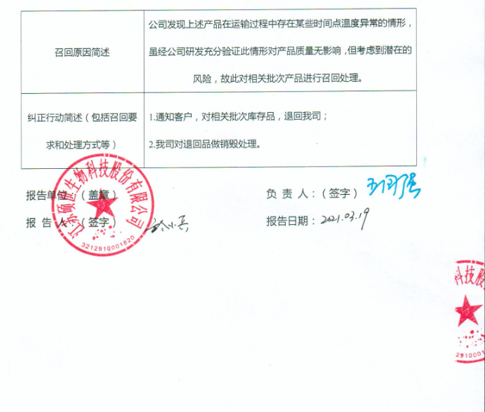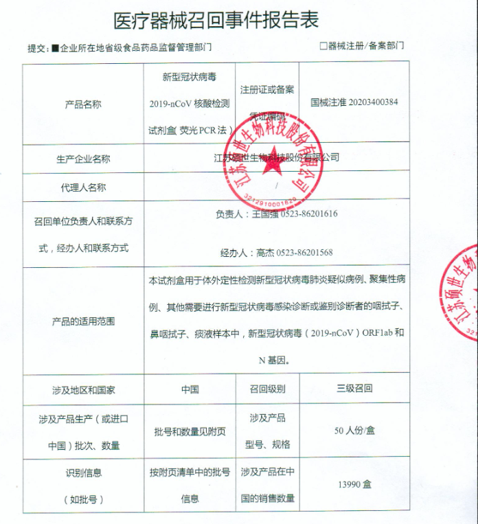 江苏硕世生物科技股份有限公司报告,该企业的新型冠状病毒2019-nCoV核酸检测试剂盒(荧光pCR法)在运输过程中存在某些时间点温度异常的情况,其研发部门充分验证对产品质量无影响,但考虑到潜在的风险,现主动召回,召回级别为三级。涉及产品的具体信息见《医疗器械召回事件报告表》