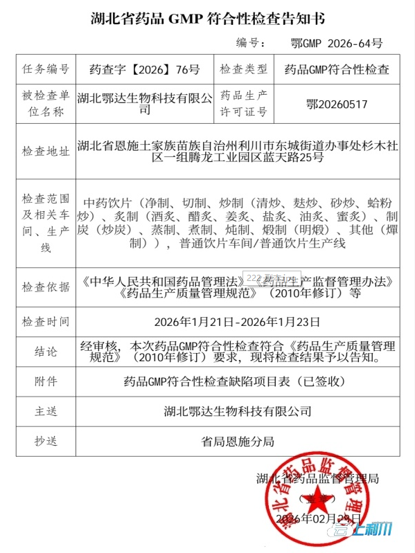 作为药品产销的“准入通行证”,此次获批是对鄂达生物综合实力的权威认证——从质量管理体系、生产设施设备,到工艺控制、人员资质及合规管理,均通过严苛检验。这不仅为企业合法开展药品生产筑牢根基,更将为其依托恩施丰富药材资源、推动黄精等道地中药材研发创新与产业化,注入强劲动能。