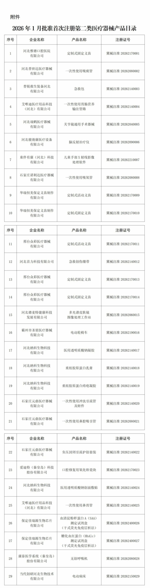2026年1月,河北省药品监督管理局共批准首次注册第二类医疗器械产品29个(详见附件)。