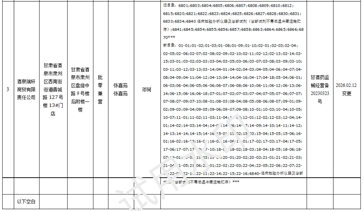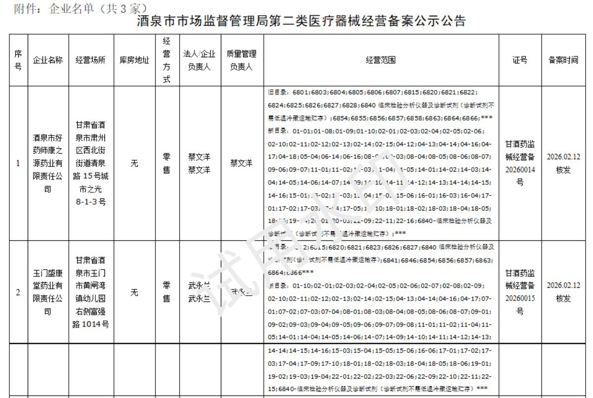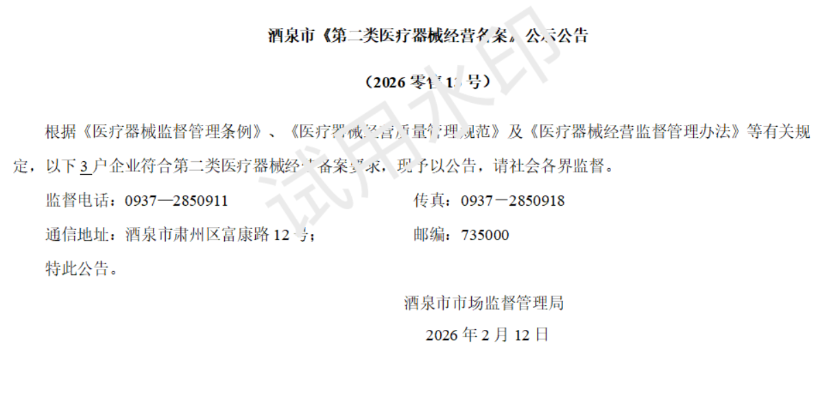 酒泉市《第二类医疗器械经营备案》公示公告(2026零售13号)