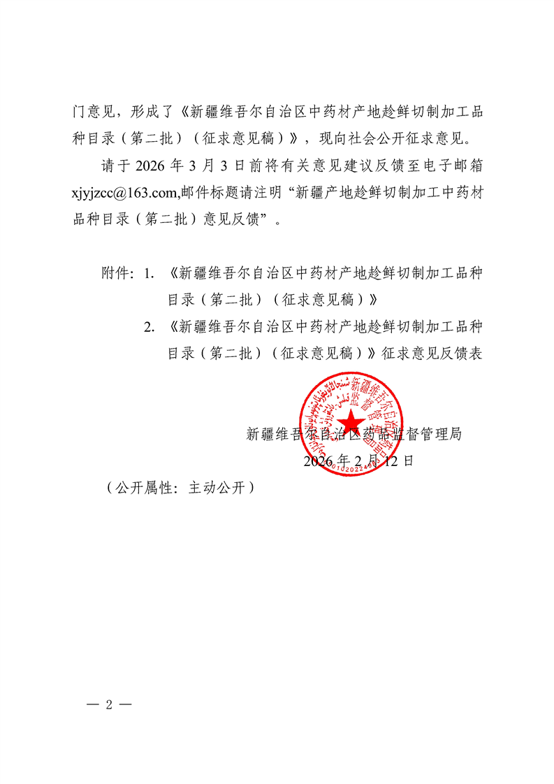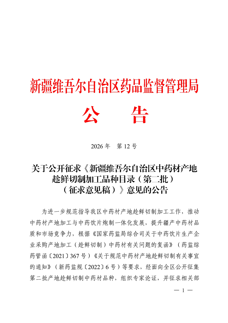 关于公开征求《新疆维吾尔自治区中药材产地趁鲜切制加工品种目录(第二批)(征求意见稿)》意见的公告
